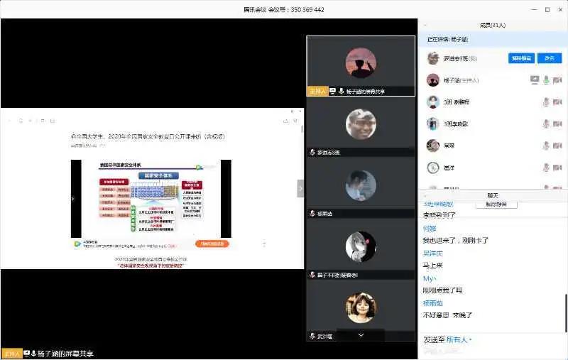 活动中,各班团支书首先带领同学们在易班、中国大学生在线等平台观看题为“总体国家安全观视角下的疫情防控”的2020年全国高校国家安全教育公开课,使同学们对国家安全的相关知识有进一步的了解。接下来,各班团支书通过“共享屏幕”等功能为大家介绍国家安全的各个方面、法律的定义、法律精神的内涵等内容。同学们积极开展线上互动,踊跃发言,各抒己见,在谈及“为什么要维护国家安全”这个问题时,李宁同学表示:“家是最小国,国是千万家。国泰方能民安,就像习近平总书记说的那样,国家安全不是遥远的‘谍战片’,而是与我们每一个人、每一个家庭息息相关、近在咫尺的‘生活片’。在维护国家安全上,人人都不是局外人、旁观者,而是人人有责,人人尽责。”