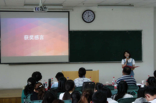 2013级新闻学专业杨慧同学作为获奖学生代表发表获奖感言。她谈到,在参赛的过程中,有艰辛也有快乐,更重要的是通过这次比赛成长了许多,收获了许多,同时也希望在座的同学珍惜传播文化艺术节的平台,积极参与到活动中,争取优秀的成绩。