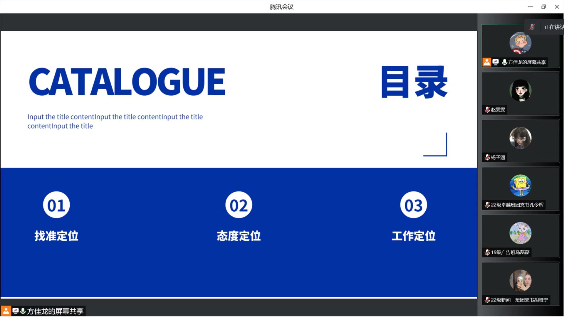2020级卓越新闻传播人才班班长方佳龙以“新生班委的日常工作”为重点提出建议:一是班委要摆正工作定位,班委的职责是为同学们服务;二是班委要做好个人时间管理,平衡好学习和工作的关系,真正实现在工作中不断锻炼和成长。