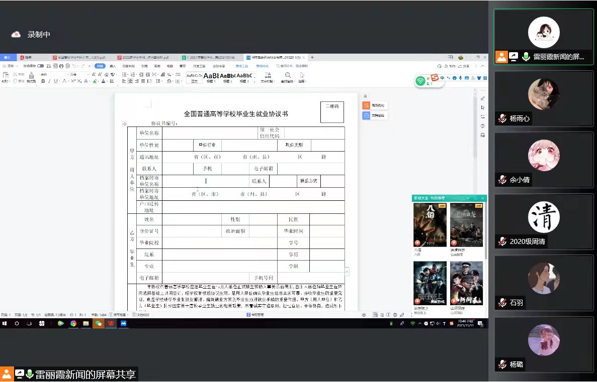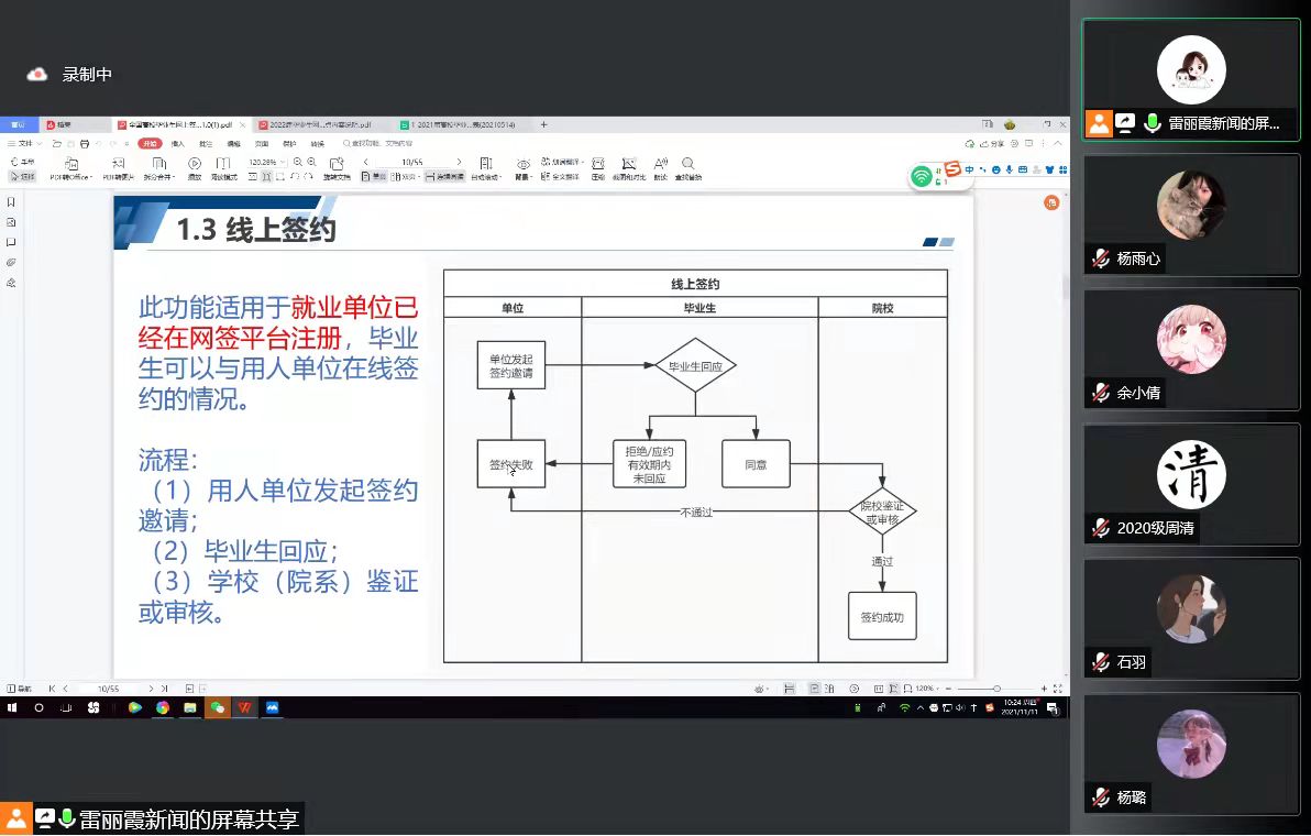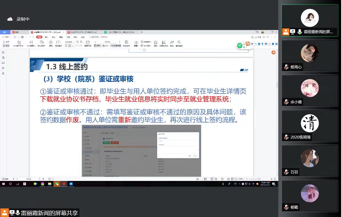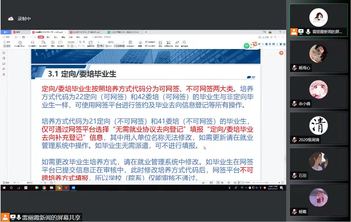 为切实做好2022届毕业生就业工作,帮助2020届毕业生更好地熟悉网签系统,11月11日上午,我院召开“全国高校毕业生网上签约与毕业去向登记平台使用培训”线上指导主题讲座,学生办公室主任雷丽霞主讲,2020级届全体毕业生在线聆听。