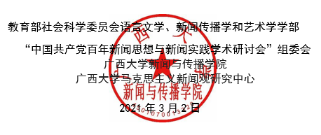 为庆祝党的百年华诞,教育部社会科学委员会语言文学、新闻传播学和艺术学学部和广西大学新闻与传播贝宝官网,经与中国人民大学、中国传媒大学、复旦大学、清华大学、北京大学、武汉大学、华中科技大学、上海交通大学、暨南大学等全国31个省市自治区60余所高校的新闻与传播贝宝官网和研究机构友好协商,定于5月22-23日在南宁共同举办“中国共产党百年新闻思想与新闻实践学术研讨会”。我们希望通过学术研讨与经验交流,为深化中国共产党新闻思想与新闻实践研究,推动马克思主义新闻观中国化作出新的贡献。