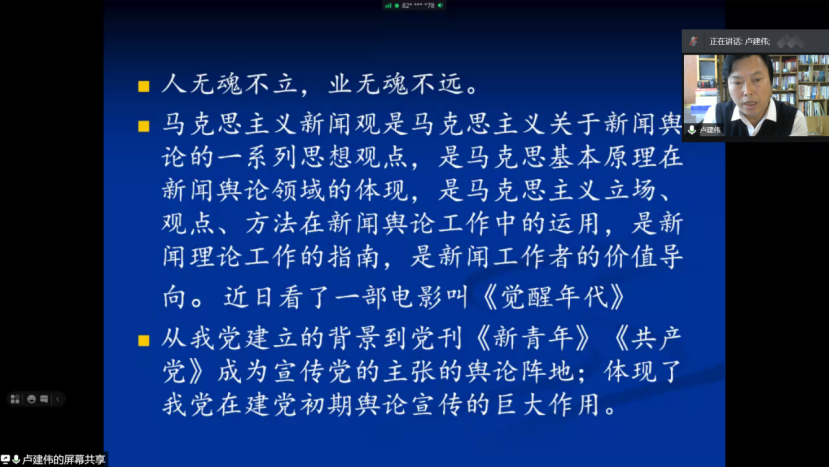 共同承办的2021年马克思主义新闻观讲座第一讲如期举办。本次讲座特邀多次荣获中国广播电视新闻一等奖、辽宁好新闻一等奖,曾连续两届荣获辽宁省好记者讲好故事第一名,大连新闻传媒集团大连电视台贝宝官网记者卢建伟,做“传承红色基因——做党和人民信赖的新闻人”的专题讲座。