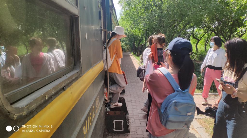 上午九点我们从大武口站出发,乘坐绿皮小火车前往大磴沟站。在乘车期间,同学和火车上的乘客沟通采访、拍摄车内场景,出站后由火车转汽车,几分钟的车程后,就来到了今天的第一站,讲解员为同学讲解了大致情况,当地政府为打赢贺兰山综合治理攻坚战,共关闭退出煤矿39家、非煤矿山61家、涉煤企业582家,退出煤炭产能1600万吨,完成治理面积146平方公里。同学们认真聆听后提出问题、给予反馈,对该区域的生态治理有了更为深刻地认识,牢固树立了绿水青山就是金山银山的理念。与此同时,同学们进行大量的拍摄工作。