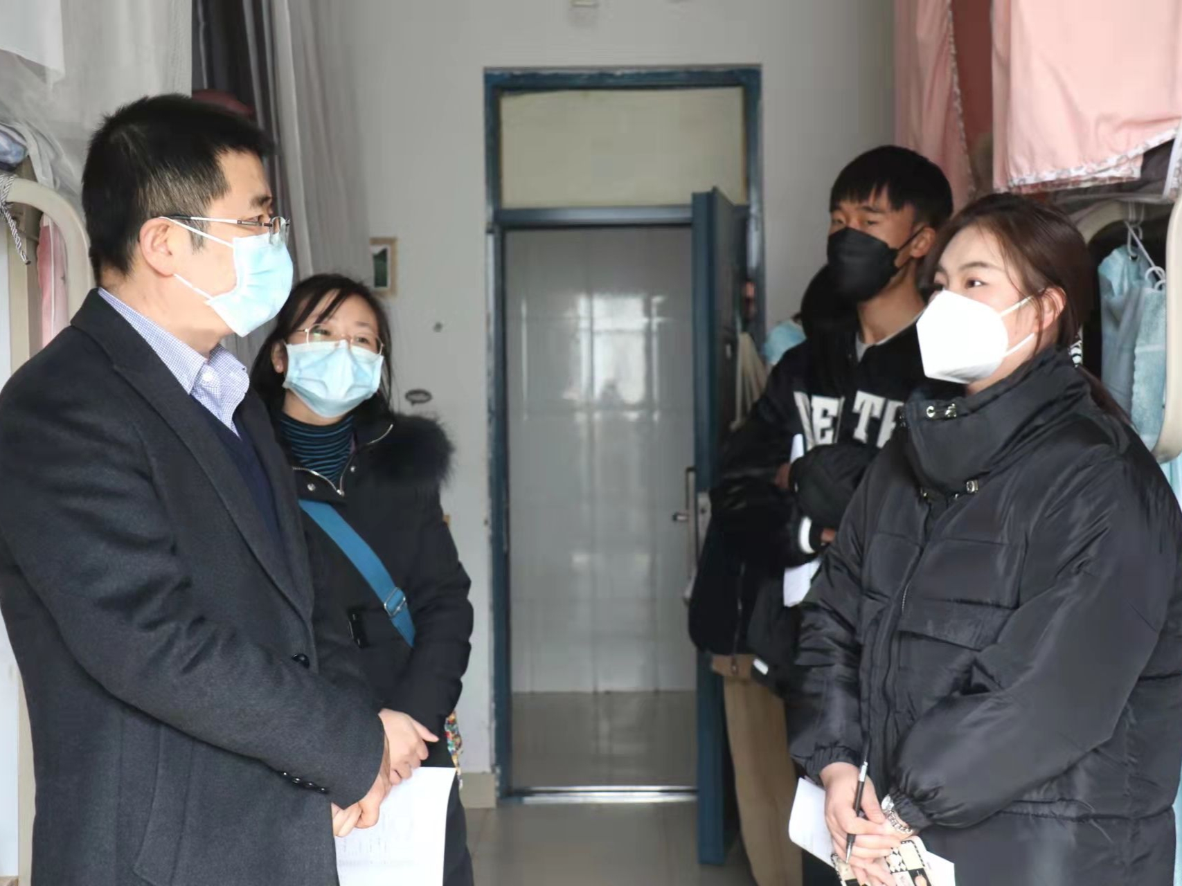 贝宝官网党总支书记潘瑞、党总支副书记李晓珉、副院长于鹏亮、研究生办公室秘书高燕前往怀远校区看望返校的研究生同学,并与大家进行了亲切交流,潘瑞表示:“疫情期间,大家要注意防护,保持宿舍卫生,勤通风,筑牢疫情防控常态化安全线。同时还要及时制定自己的学习和生活目标,快速调整心态,以饱满的精神状态迎接新学期的到来。”