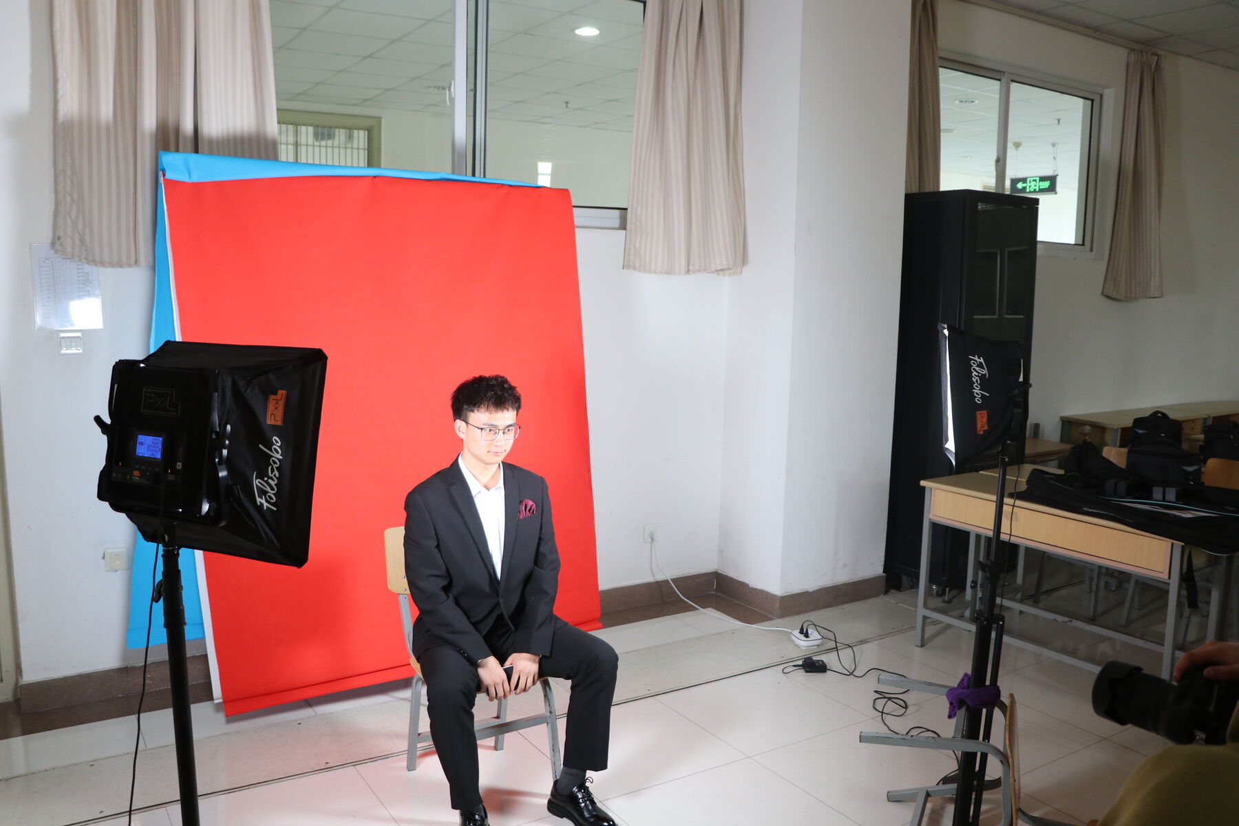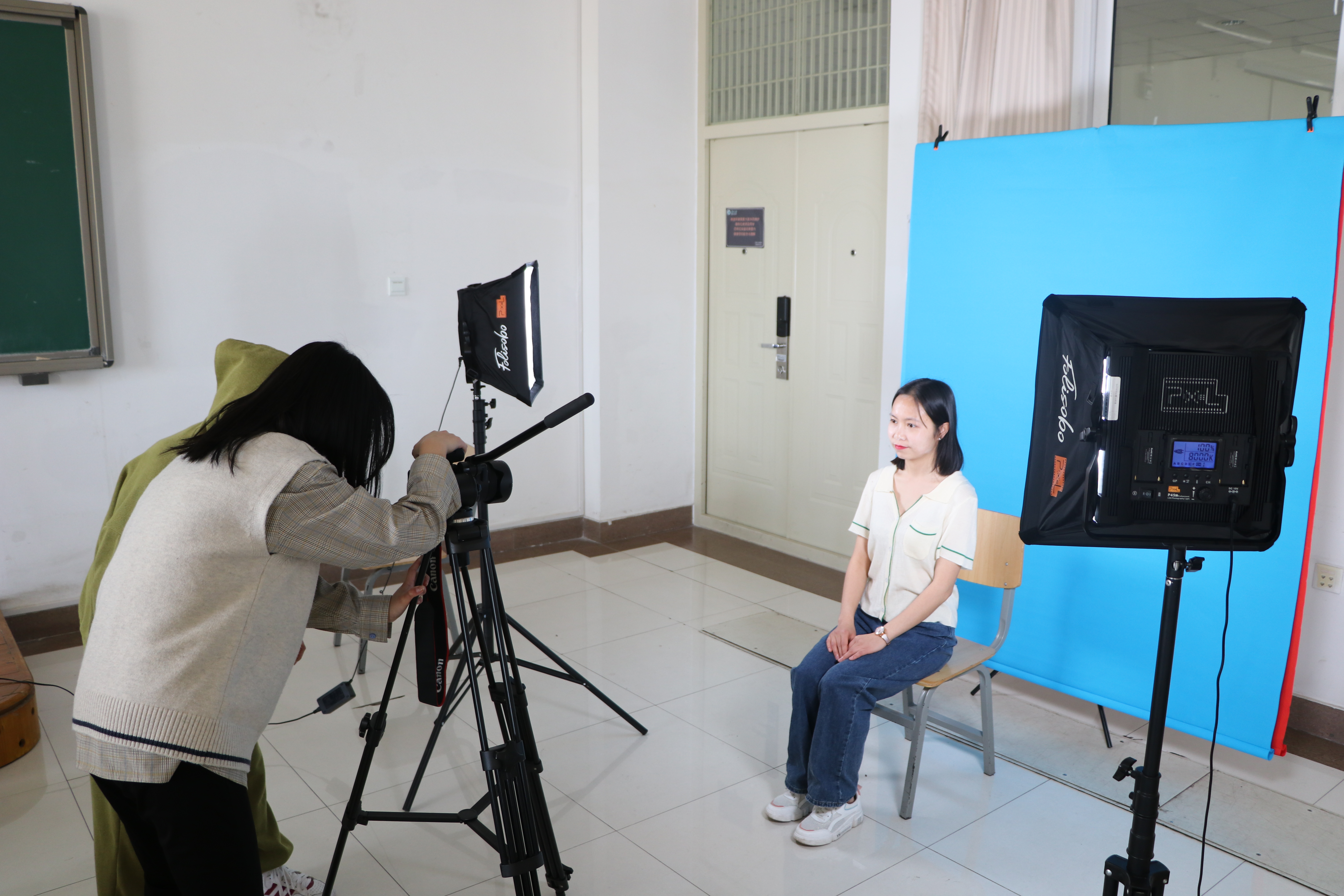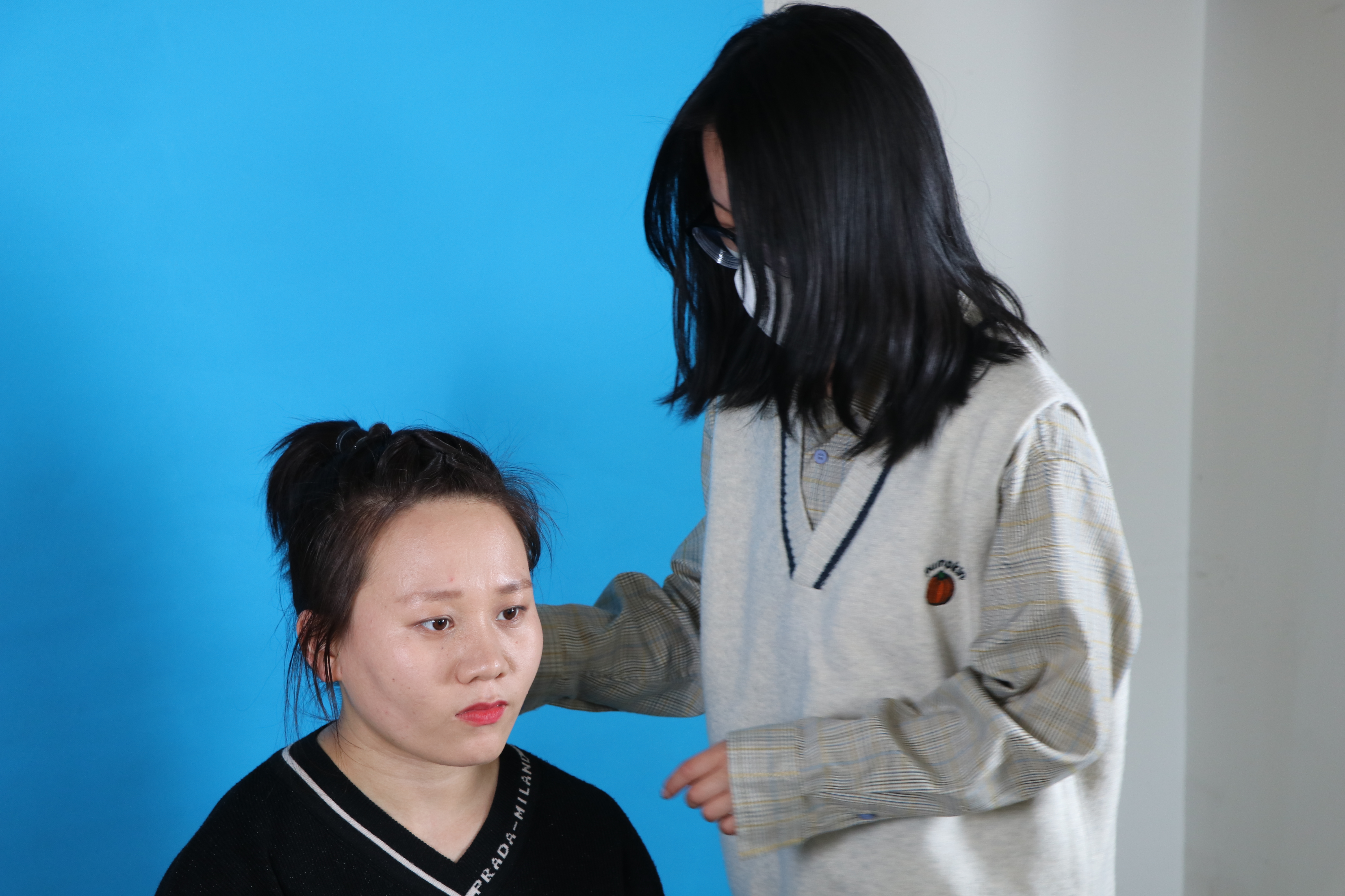 志愿者为同学们整理衣冠拍摄一寸照