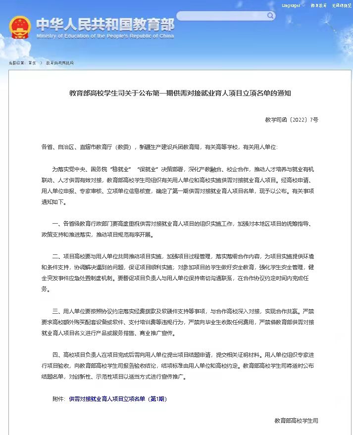 为落实党中央、国务院“稳就业”“保就业”决策部署,深化产教融合、校企合作,推动人才培养与就业有机联动、人才供需有效对接,教育部高校学生司组织有关用人单位和高校实施供需对接就业育人项目。贝宝官网