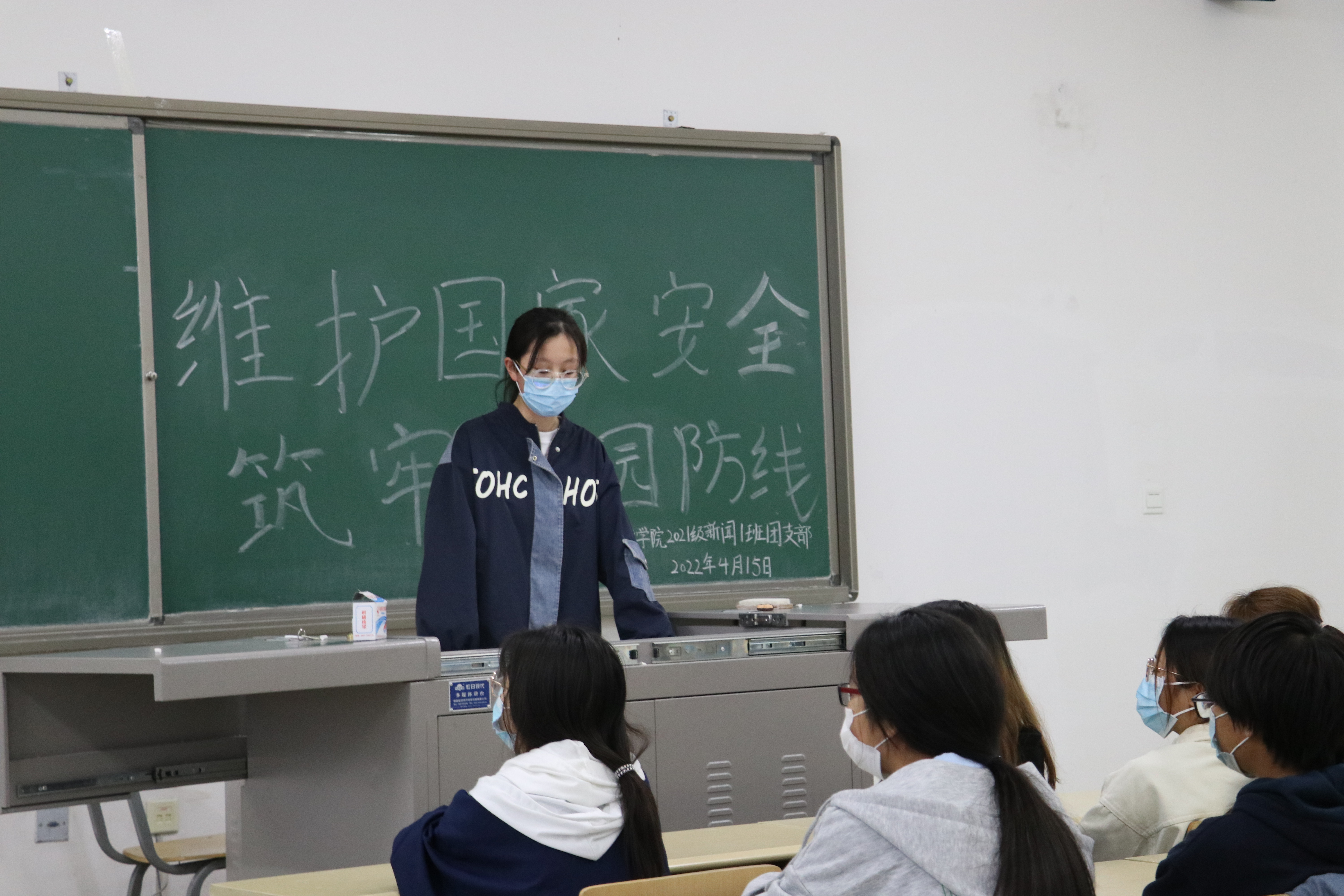 活动伊始,21级二班团支书李双双以国家安全主题视频为切入点,结合案例为同学们介绍了国家安全的定义及相关概念,增进同学们对于国家安全重要性的了解。他讲到:“国家安全和我们每个人的生活息息相关。只有国家安全了,我们才能有更好的生活。国防是国家安全的有力保障,所以我们此刻的主要任务是学好科学文化知识,增强国防观念。”21级一班团支书姜宁歆在最后倡导大家道:“作为国家的一份子,我们能做的就是逐渐充实自己的文化知识,提高自己的实践能力,为维护国家安全提供力量。”