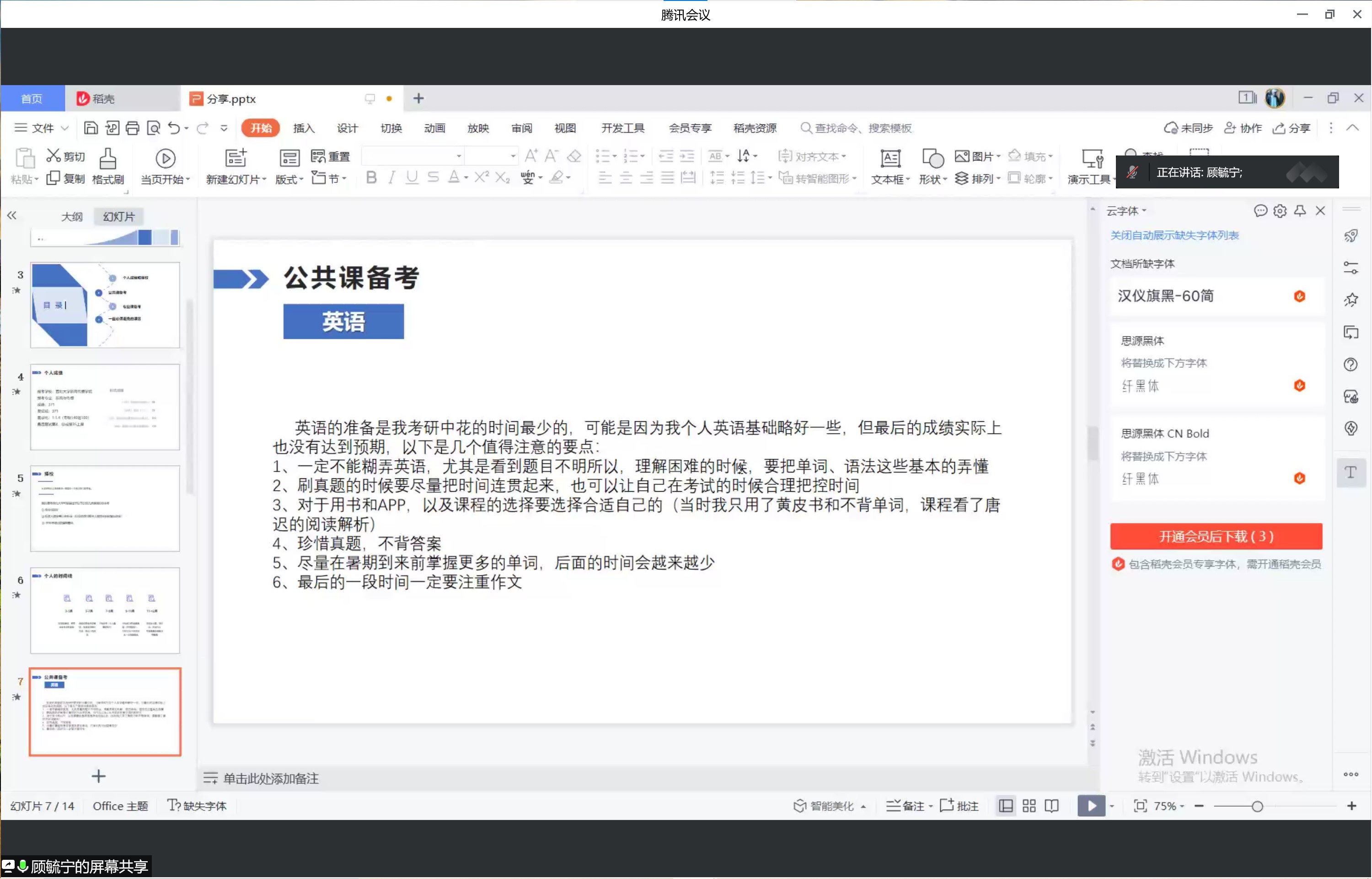 顾毓宁则从个人择校、公共课备考、专业课备考和误区四方面展开关于个人考研的经验分享。他提醒大家要合理安排时间线,做好长期规划,有针对性地复习英语、政治等公共课,在专业课上掌握好基础知识、培养做题的思维与习惯、多练实务、注意专题热点。