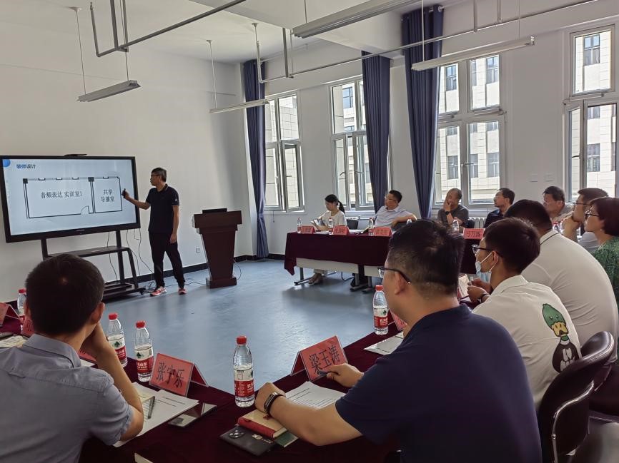 此次会议主要审议一期建设方案。通过汇报各实验室具体设计方案,确保一期实验室建设项目能落地开展。宁夏万盈科技公司项目负责人逐一将音频直播室、音频表达实训室等6个实验室的建设设计思路、具体设备的技术指标等情况进行汇报。评审专家逐一提出了建设建议。