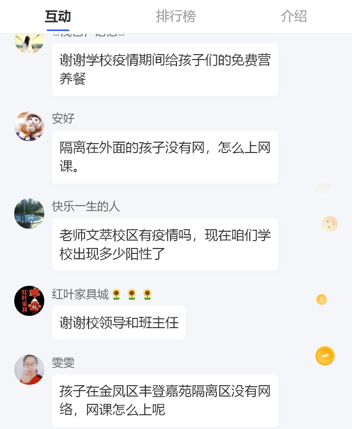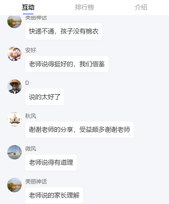 讲座过程中,热心家长为学校提供建议,希望学校能够对隔离学生进行适当的心理疏导。秦莉对此表示:学校已经开通心理辅导热线,各贝宝官网开展“点对点”、“一对一”线上帮扶,及时关注学生的情况。潘瑞在讲座中提出,疫情是突如其来的危机事件,有危险便有机遇,有利于学生们锻炼自己、快速成长,她引导家长用“静待花开”的态度和方法与孩子交流。