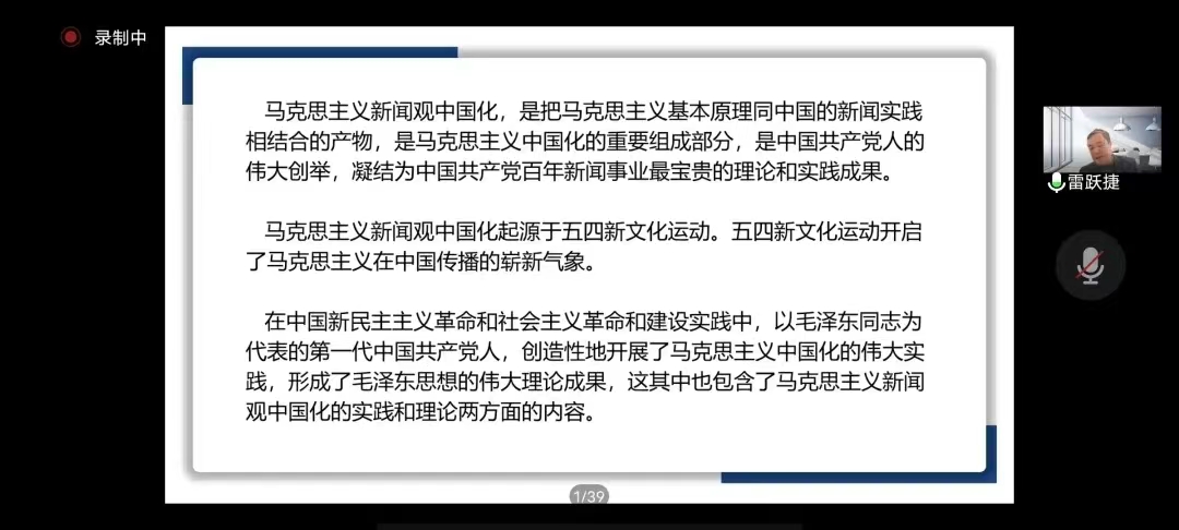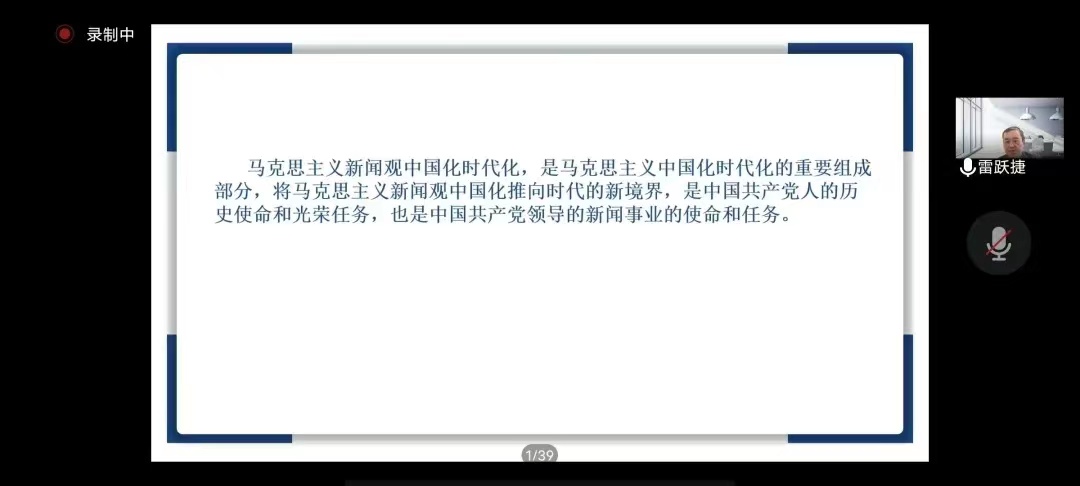 雷跃捷着重讲授了党的十八大以来,习近平总书记新闻工作重要论述,将新时代党的新闻舆论工作理论体系概括为“新闻舆论工作本质论”“新闻舆论工作规律论”和“新闻工作实践论”三部分,并对其基本内容进行深刻阐释。他总结道,习近平新时代中国特色社会主义思想是当代中国的马克思主义,是21世纪的马克思主义,习近平总书记新闻工作重要论述是习近平新时代中国特色社会主义思想的有机组成,其本质是中国共产党对新时代治国理政、定国安邦方略的新闻学表达。马克思主义新闻观的中国化、时代化是马克思主义中国化、时代化的重要组成部分,它的探索创新和发展,应建立在当代中国新闻工作的实践基础之上。将马克思主义新闻观中国化推向时代的新境界,是中国共产党人的历史使命和光荣任务,也是中国共产党领导的新闻事业的使命和任务。