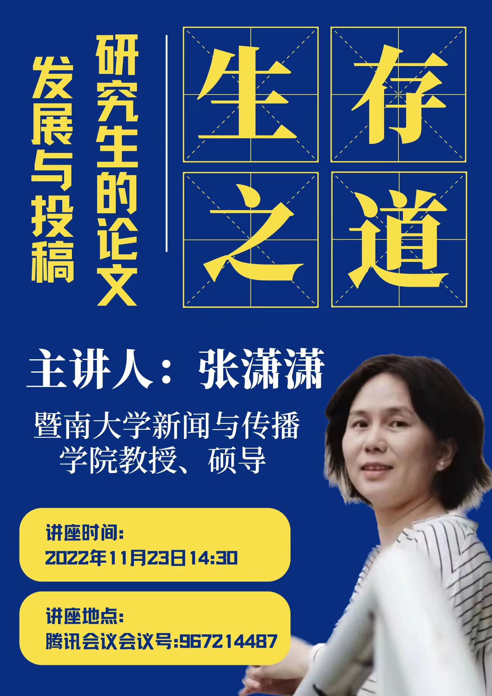 暨南大学新闻与传播贝宝官网教授张潇潇将于11月23日在线上开展《生存之道:研究生的论文发展与投稿》的讲座。