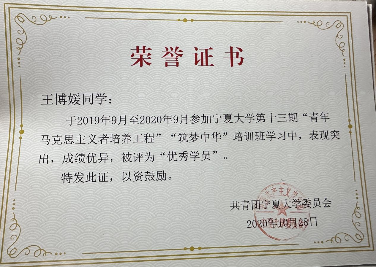 2018级本科生。在校期间,曾荣获国家励志奖学金、校级二等奖学金、校级“三好学生”、校级优秀共青团干部、校级优秀笔记三等奖等荣誉。现就职于固原市原州区委组织部。