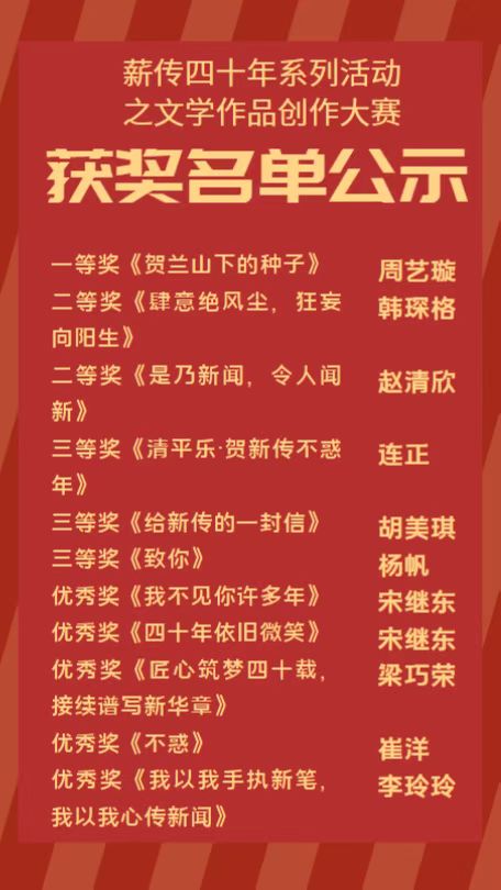 为引导我院学生深入学习宣传贯彻党的二十大精神,迎接新闻传播教育创办四十周年,展示新时代宁大新闻学子的优秀素养与精神面貌,营造良好的新闻学习氛围,推进贝宝官网 建设贡献力量,我院举办薪传四十周年文学作品与广告创意系列作品比赛,现将获奖结果公示如下: