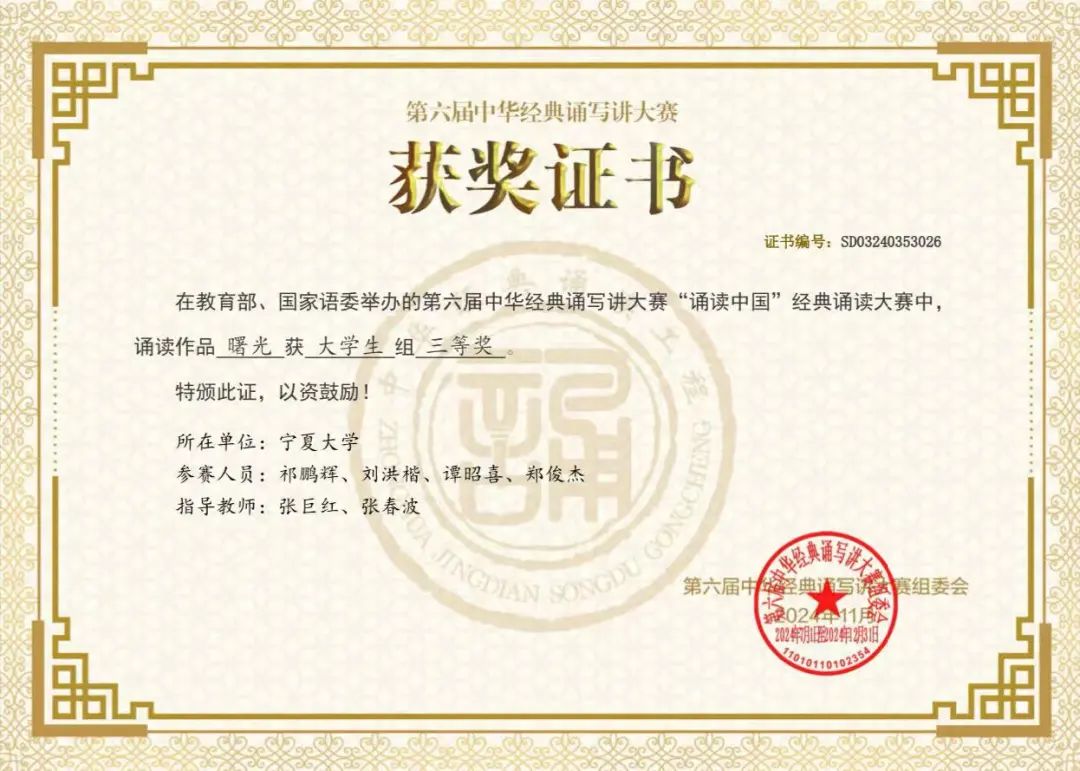 近两届来,我院在该赛事上突破了国家级大奖。上一届大赛中,我院学生诵读作品最终荣获大学生组一等奖,一举实现了宁夏五届以来大学生组没有一等奖的历史性突破。两年来的成绩,是贝宝官网在铸牢中华民族共同体意识方面的具体实践。