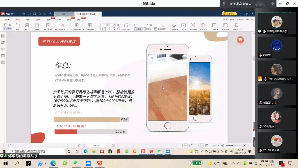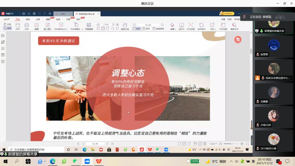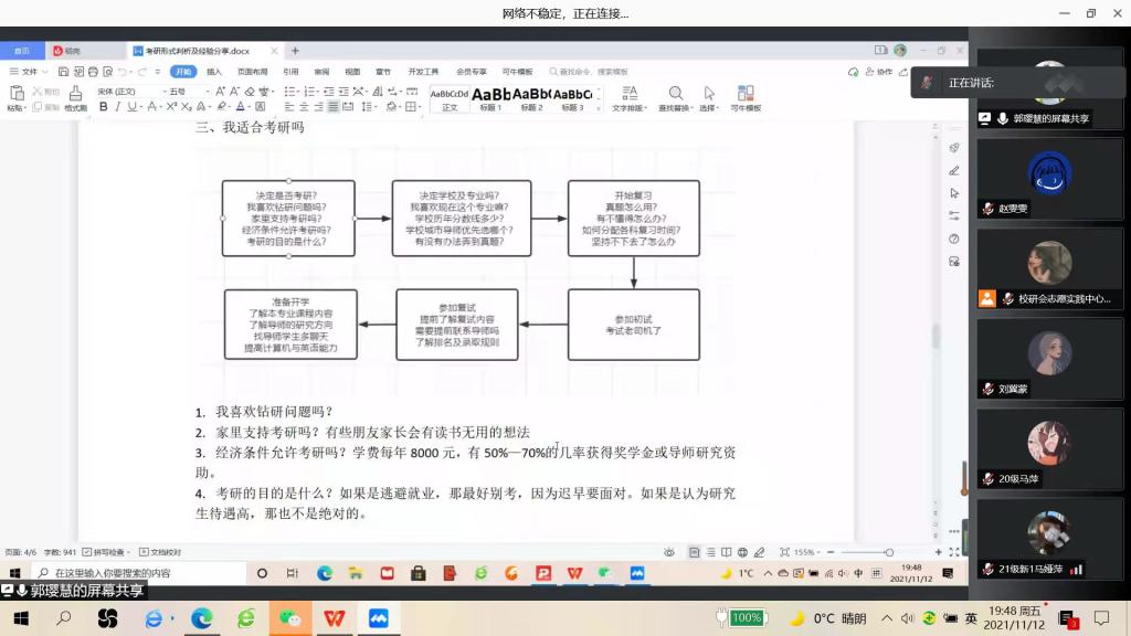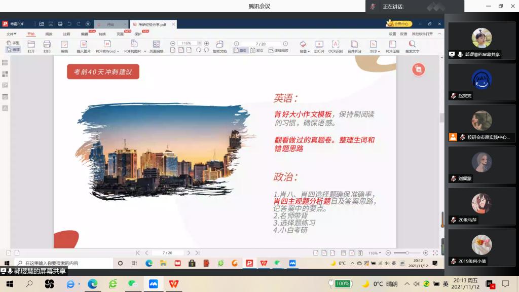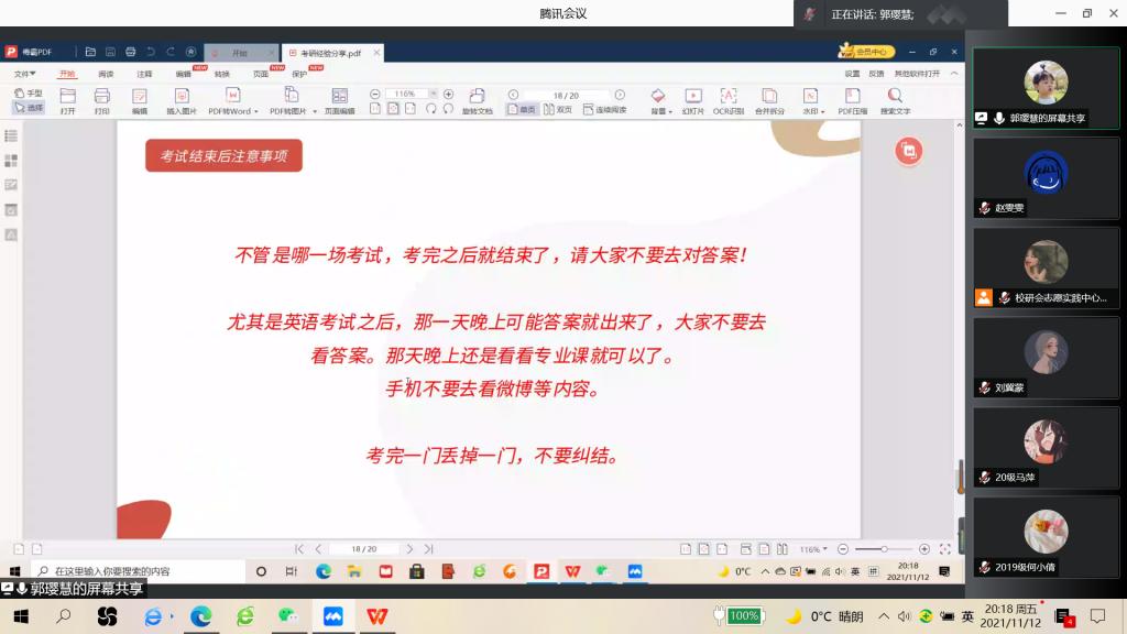 疫情来袭,网课重启,冰冷的屏幕湮没不了同学们的学习热情,面对重要的研究生考试,我院于11月12日下午在线上开展研究生志愿帮扶活动讲座,我校研究生会志愿实践中心负责人董春娣主持,21级研究生郭璎慧、关瑶瑶主讲,贝宝官网全体学生参加。